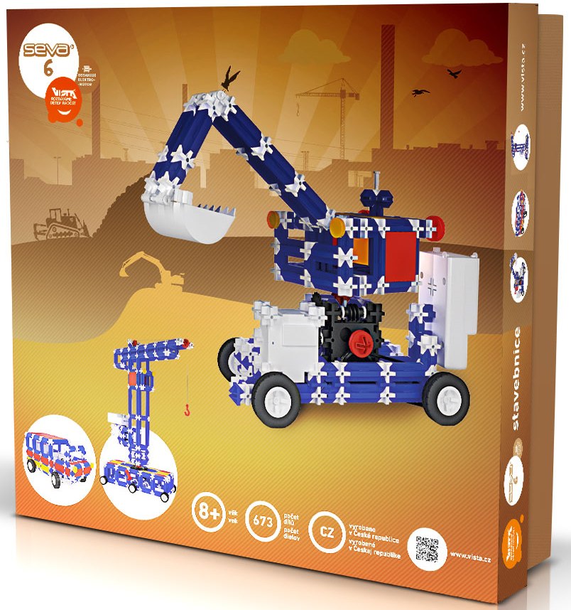 Seva 6 Elektro625Základní stavební díly + 4 kola + volant + 14 ozubených koleček + motorek s převodovkou na 3 baterie AA. Vhodné pro stavbu funkčních modelů poháněných motorkem. Plánky přiloženy. Od 8 let.1231